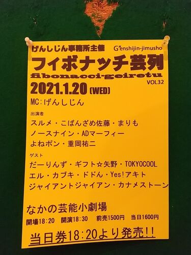 初のげんしじん事務所の事務所ライブへ。何年か前にたまたま流れてた有ジェネのアングラ芸人ネタバトルでスルメを見て、最初は何だこの人と思ったけど、見てるうちにちょっと本物も見てみたくなってきたのです。それだけじゃなくて、ゲストで来てる他の芸人…